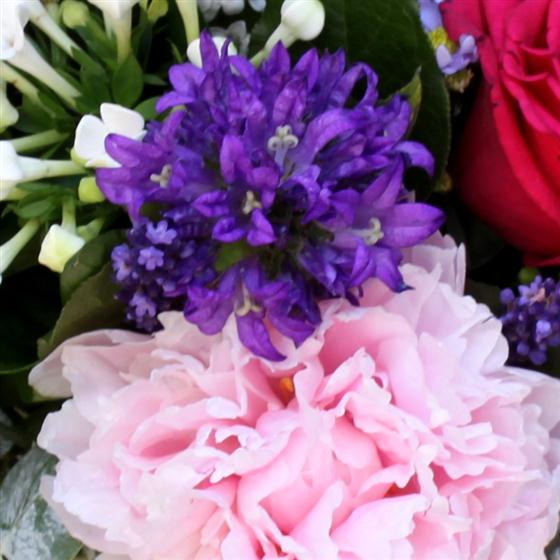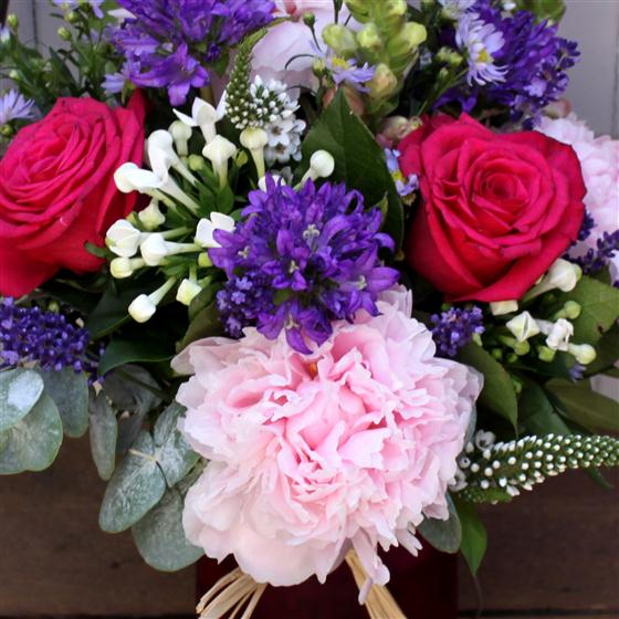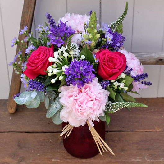 A glass jar expertly filled with country garden flowers. An informal, scented mix of seasonal blooms that are sure to please.