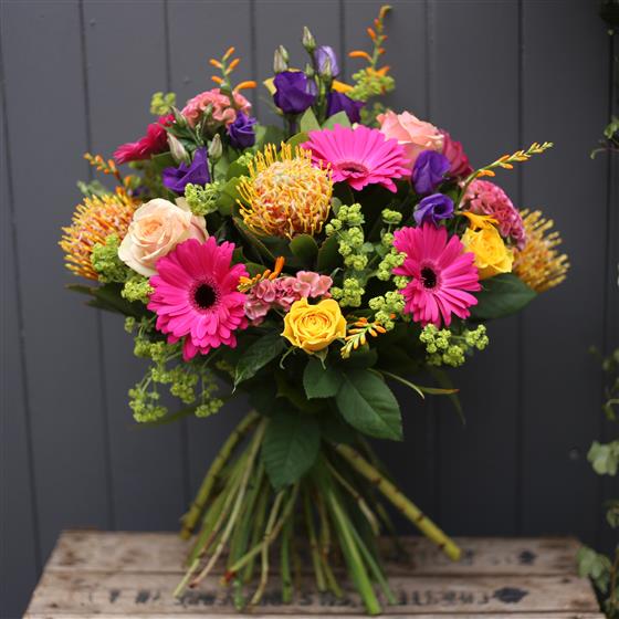 A vibrant, happy selection of the very best seasonal flowers in a variety of strong colours complimented with seasonal foliages.